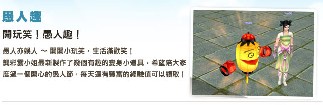 在活動時間內,每位 10 級以上的玩家皆可以到大理 龔彩雲( 170,122 )處參加愚人節活動,每人每天限參加一次