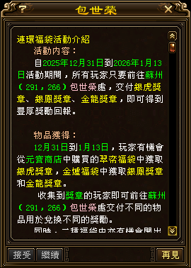 活動期間,角色可至蘇州包世榮(291,266)處交付對應的銀虎獎章、銀鳳獎章、金龍獎章,即可獲得到對應的豐富獎勵。
