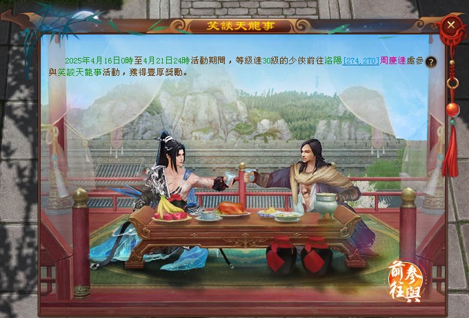活動期間,等級達30級的少俠每日前往洛陽(274,270)週慶達處,領取相應信物,前往對應天龍名士處,與其笑談天龍事,將獲得豐厚獎勵。