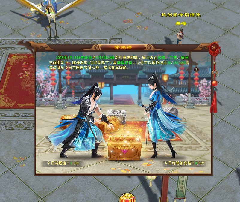 - 每日11點、13點、15點、17點、19點、21點、23點,將在洛陽、大理、蘇州三個場景中,隨機選取1個場景降下大量鴻福寶箱。