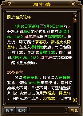 - 每日前往洛陽(261,248)週年清處領取夢春秋。