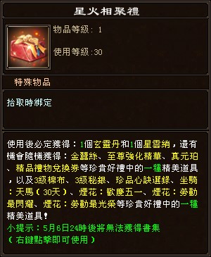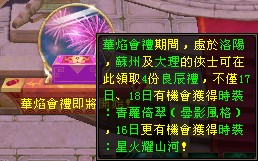 - 華焰會禮活動期間,等級≥30級的玩家可前往洛陽、蘇州或大理觀賞煙火,領取良辰禮。