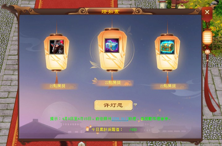 - 每日22:00前,放飛花燈將會獲得燈會券。當日22:00前,在共赴江湖夢-燈如晝介面,點擊許燈願可使用燈會券來報名。