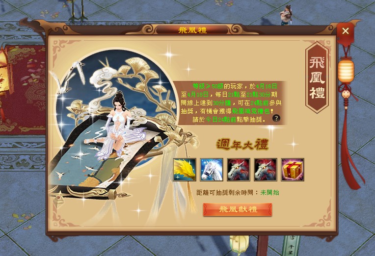 每日21點至21點30分期間在線或登陸遊戲,且在22點前累計在線時間達到30分鐘,即可在主界面上方點擊飛凰禮,參與抽獎活動。