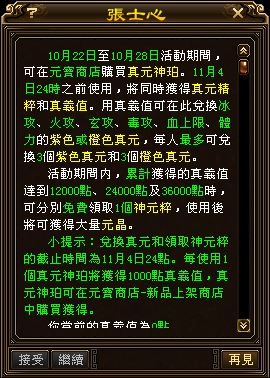 2.活動期間內,累計獲得的真義值達到12000點、24000點及36000點時,可分別免費領取1個神元粹,使用後將可獲得大量元晶。