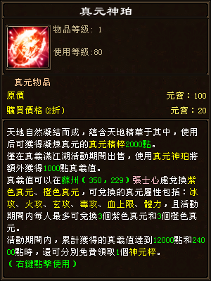 1.活動期間,可在元寶商店購買真元神珀,2025年11月04日23:59之前使用,將同時獲得真元精粹和真義值。用真義值可在此兌換冰攻、火攻、玄攻、毒攻、血上限、體力的紫色或橙色真元,每人最多可兌換3個紫色真元和3個橙色真元。