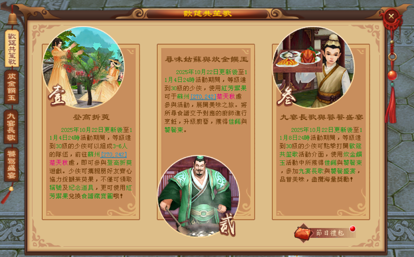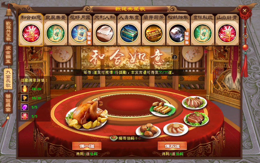 等級達到30級的少俠,可使用炊金饌玉活動中所得:佳餚,參加主介面上方“歡筵共笙歌”按鈕中“九宴長歌”的抽獎活動,依次從和合如意、良辰美景、花好月圓、天利人和、人夀年豐、蘭秀菊芳、松鶴瑞年、豐穰秋收、山嶽辭青九張桌子中抽取獎勵。