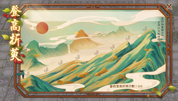 日採擷完成,即為完成登高折萸1次,累計登高折萸8次後可在蘇州(270,242)楚天秋處領取金枝祥瑞賞,包括:稱號:漫采茱萸賀金秋、紀念道具:登高折萸圖。