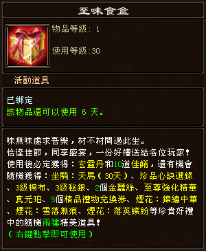 等級達到30級的少俠,可打開遊戲主介面上方的歡筵共笙歌介面,領取至味食盒。