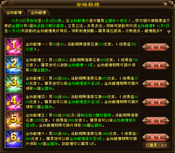 領回饋禮:2025年11月05日00:00至2025年11月08日23:59間,根據購買的最高等級對應的級別,可分4次領取對應額外饋禮(每日可領取1次),購買等級越高可領取金蠶絲總數越多哦!
