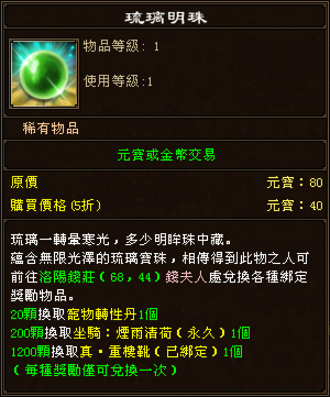 活動期間月白珍珠與琉璃明珠將於元寶商店登場,本次的天降明珠曜重樓活動,可至洛陽錢莊錢夫人處進行本次的活動品項兌換真·重樓靴、坐騎:煙雨清荷、寵物轉性丹和真元戰魂禮盒·橙在內的豐富獎勵。