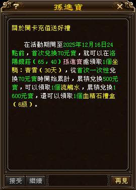 1.首次兌換70元寶,就可以在洛陽錢莊(65,40)孫進寶處領取1個30天坐騎:青霄(綁定)。 2.從首次一次性兌換70元寶時開始累計,累積兌換500元寶,可以在洛陽錢莊孫進寶(65,40)處領取1個流觴水(綁定)。 3.累積兌換1600元寶,可以在洛陽錢莊孫進寶(65,40)處領取1個血精石禮盒(6級)(綁定) 。