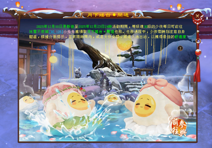 1.等級≥30級的少俠每日可前往冰雪不夜城(92,126)小兔兔處,領取任務獲得狀態:溫泉湯浴後開始任務。