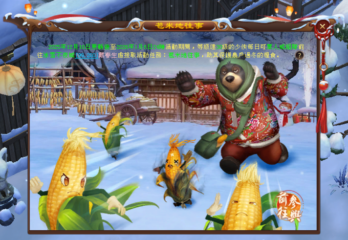 1.等級≥30級的少俠每日可單人或組隊前往冰雪不夜城(99,200)戴春生處接取活動任務:苞米地往事。