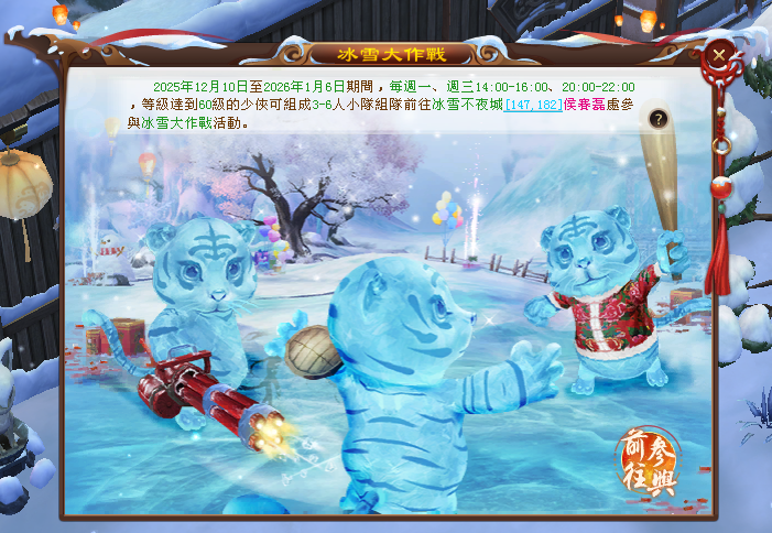 1.每週一、週三14:00-16:00、20:00-22:00,等級≥60級的少俠可組成3-6人隊伍前往冰雪不夜城(147,182)侯賽磊處參與活動。