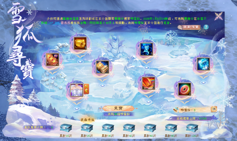4.每消耗30個喚雪鈴可進行一次覓寶,前20次尋覓有概率獲得時裝:千秋雪(永久)、武器:冰糖墩墩兒(7天)等稀有獎勵。當尋覓次數超過20次時,尋覓的寶物將進行全面升級,少俠獲得時裝:千秋雪(永久)、武器:冰糖墩墩兒(7天)的概率獲得提升,同時將有概率尋覓出3級秘銀、3級棉布、坐騎:阿拉斯基(90天)等大獎。