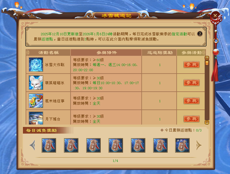 4.參與各種冰雪節活動均可獲得1點巡遊點。每日僅可從相同活動中獲得1次巡遊點。