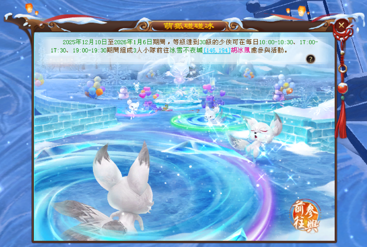 1.每日10:00-10:30、17:00-17:30、19:00-19:30,等級≥30級的少俠可組成3人隊伍前往冰雪不夜城(146,194)胡冰風處進入休息室參與活動。