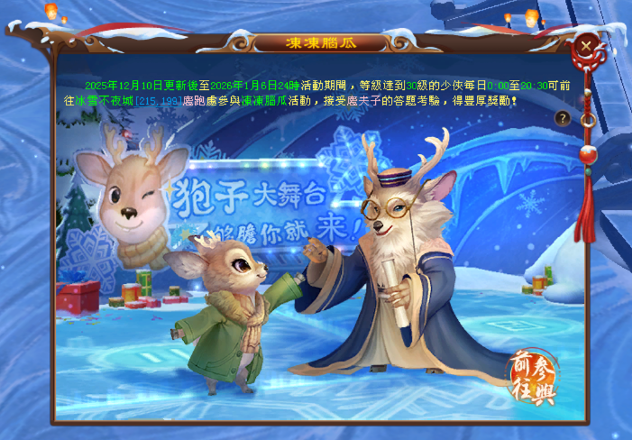 6.少俠的答題成績將會被麅跑記錄在冊,單服每日成績最高的十個人將會進入凍凍腦瓜排行榜,排行榜將在每日21:15截榜,屆時在榜少俠即可前往冰雪不夜城(215,199)麅跑處領取上榜獎勵。