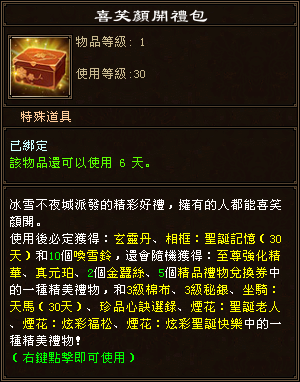 6.千秋雪禮匣:開啟後可選擇免費領取時裝:千秋雪(30天),或花費2000元寶領取時裝:千秋雪(永久)。