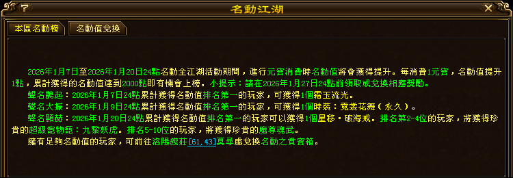 1.每消費1元寶,名動值將會提升1點。擁有足夠名動值的玩家,可以領取獎勵(如下方說明)。