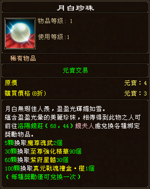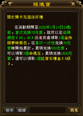 1.首次兌換70元寶,就可以在洛陽錢莊(65,40)孫進寶處領取1個金絲綴夢時裝包(綁定)。 2.從首次一次性兌換70元寶時開始累計,累積兌換500元寶,可以在洛陽錢莊孫進寶(65,40)處領取3個命魂玉(綁定)。 3.累積兌換1600元寶,可以在洛陽錢莊孫進寶(65,40)處領取1個紅寶石禮盒(6級)(綁定) 。