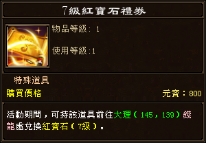 活動期間,所有玩家可以在大理(145,139)錢龍處使用7級紅寶石禮券兌換7級紅寶石。