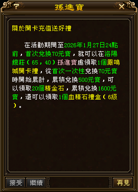 1.首次兌換70元寶,就可以在洛陽錢莊(65,40)孫進寶處領取1個鳳鳴城開卡禮(綁定)。 2.從首次一次性兌換70元寶時開始累計,累積兌換500元寶,可以在洛陽錢莊孫進寶(65,40)處領取20個精金石(綁定)。 3.累積兌換1600元寶,可以在洛陽錢莊孫進寶(65,40)處領取1個血精石禮盒(6級)(綁定) 。